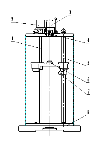 l  1 丝杠 2 步进电机 3 点火装置4 药柱模  5-立柱 6 试样模 7 锁紧旋钮  8底座